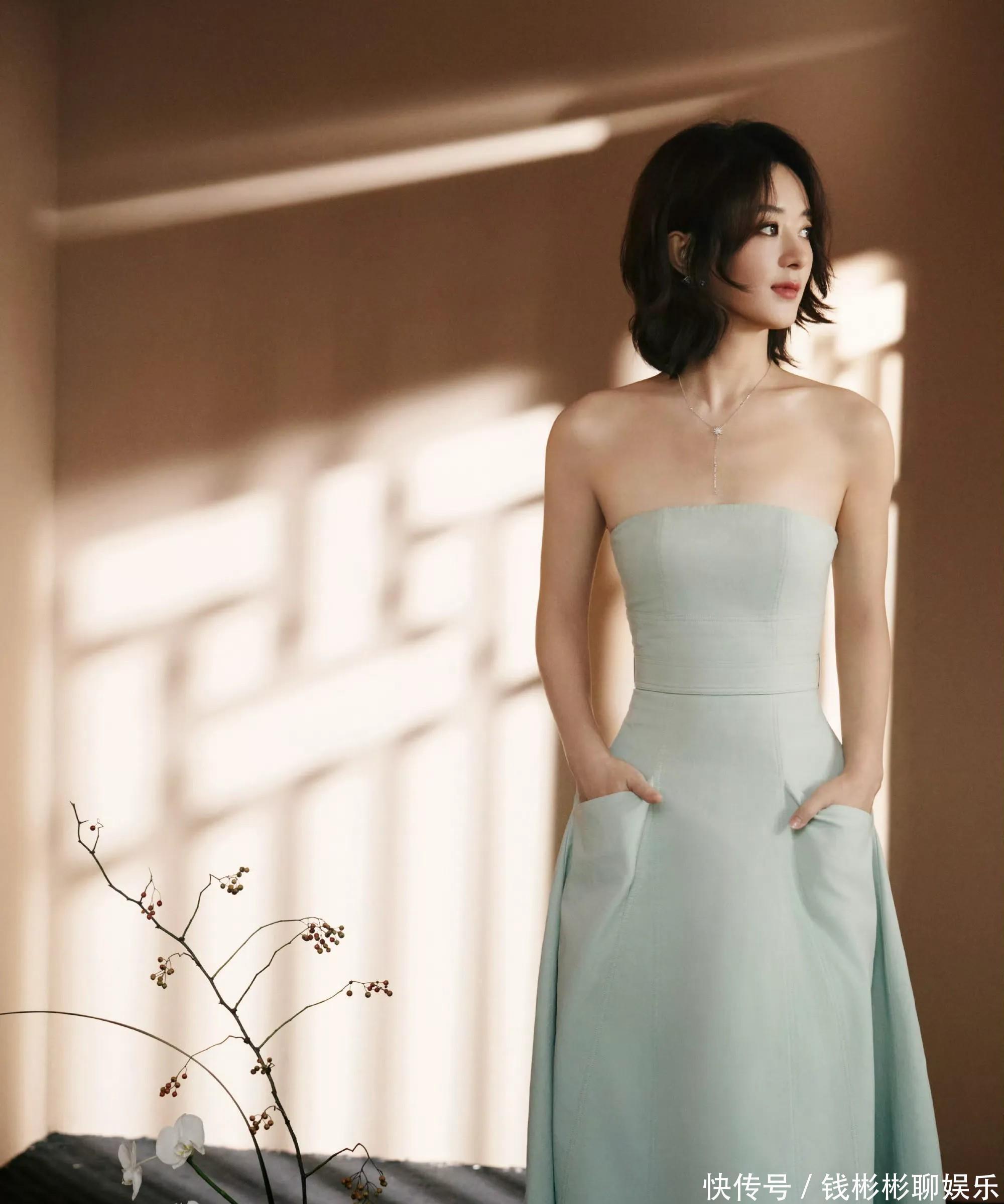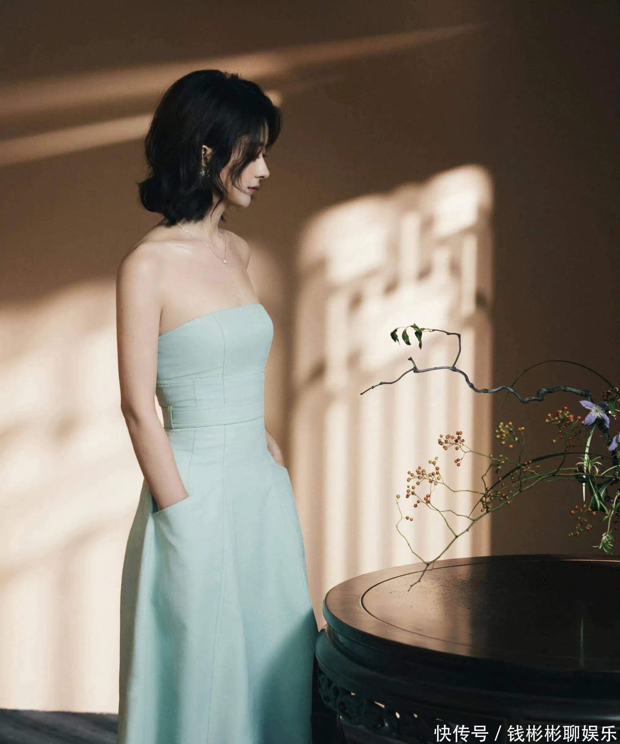 今晚的她,身穿这条薄荷绿的抹胸收腰裙,看上去整个人小小一个。这个清新的颜色,再加上她的短发,让她整个人看上去特别温婉动人。